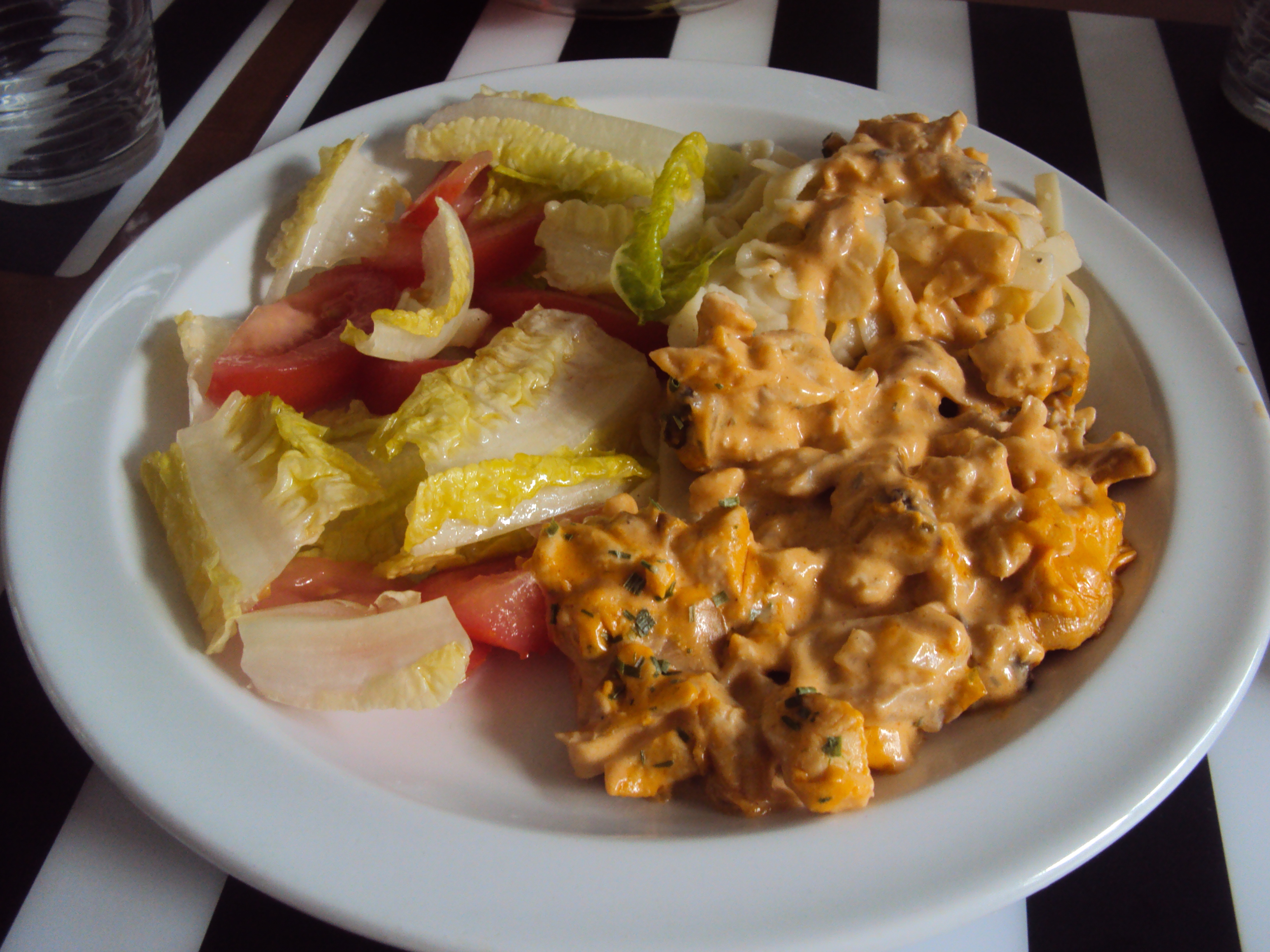 Corte os peitos de frango as tirinhas e tempere-as com sal, pimenta, alho em pó, sumo de limão e polvilhe com cebolinho. Misture muito bem no frango e reserve. Numa frigideira, coloque duas colheres de sopa de manteiga e quando a começar a aquecer junte os pedaços de frango. Quando as tirinhas de frango começarem a ficar douradinhas, retire-as do lume e reserva-as. Entretanto, ao molho de fritura do frango junte a restante manteiga, a cebola e os dentes de alho picados e deixe refogar até a cebola ficar macia. Aí junte os cogumelos e o frango. Misture tudo e junte a mostarda, o ketchup e as natas misturando bem em cada adição. Tempere com sal e pimenta e deixe cozinhar em lume brando até obter um molho cremoso. Retifique os temperos e polvilhe com cebolinho. Pode ser acompanhado com massa, arroz ou salada.