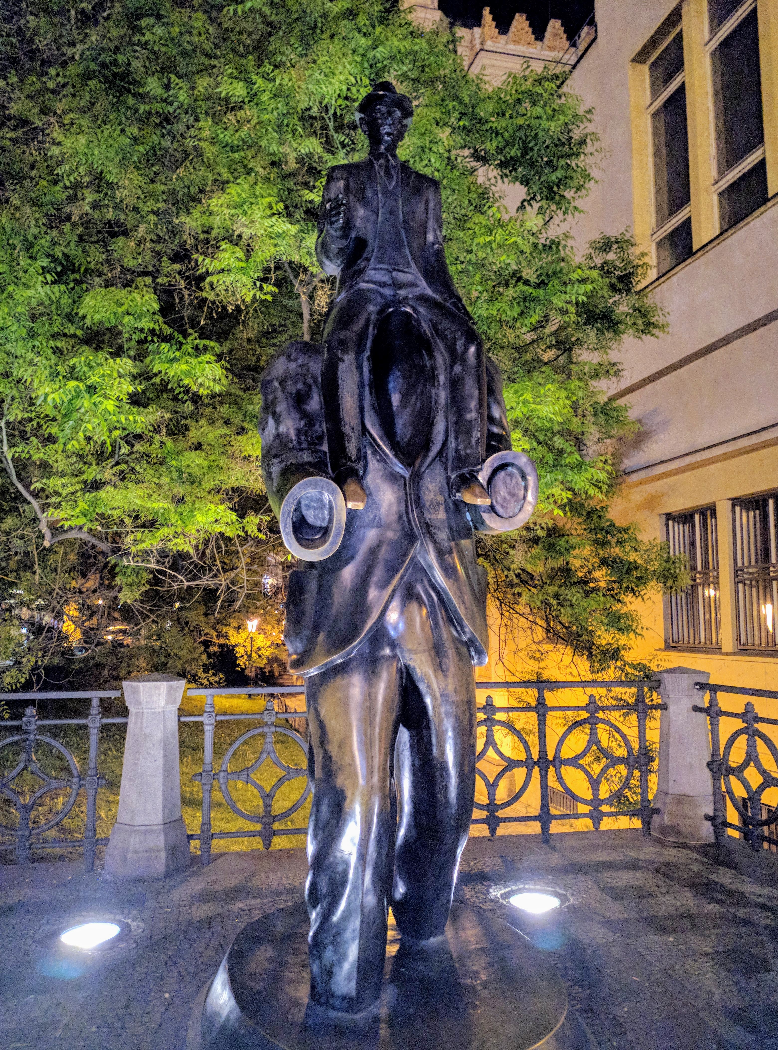 Passámos pelo Bairro Judeu para vermos a arquitectura desta zona e acabámos em frente da estátua de Franz Kafka, escultura ali colocada em 2003. Ela representa o próprio escritor sobre os ombros de um corpo sem cabeça, referindo-se à obra literária deste autor “Descrição de uma luta” (Description of a Struggle).
