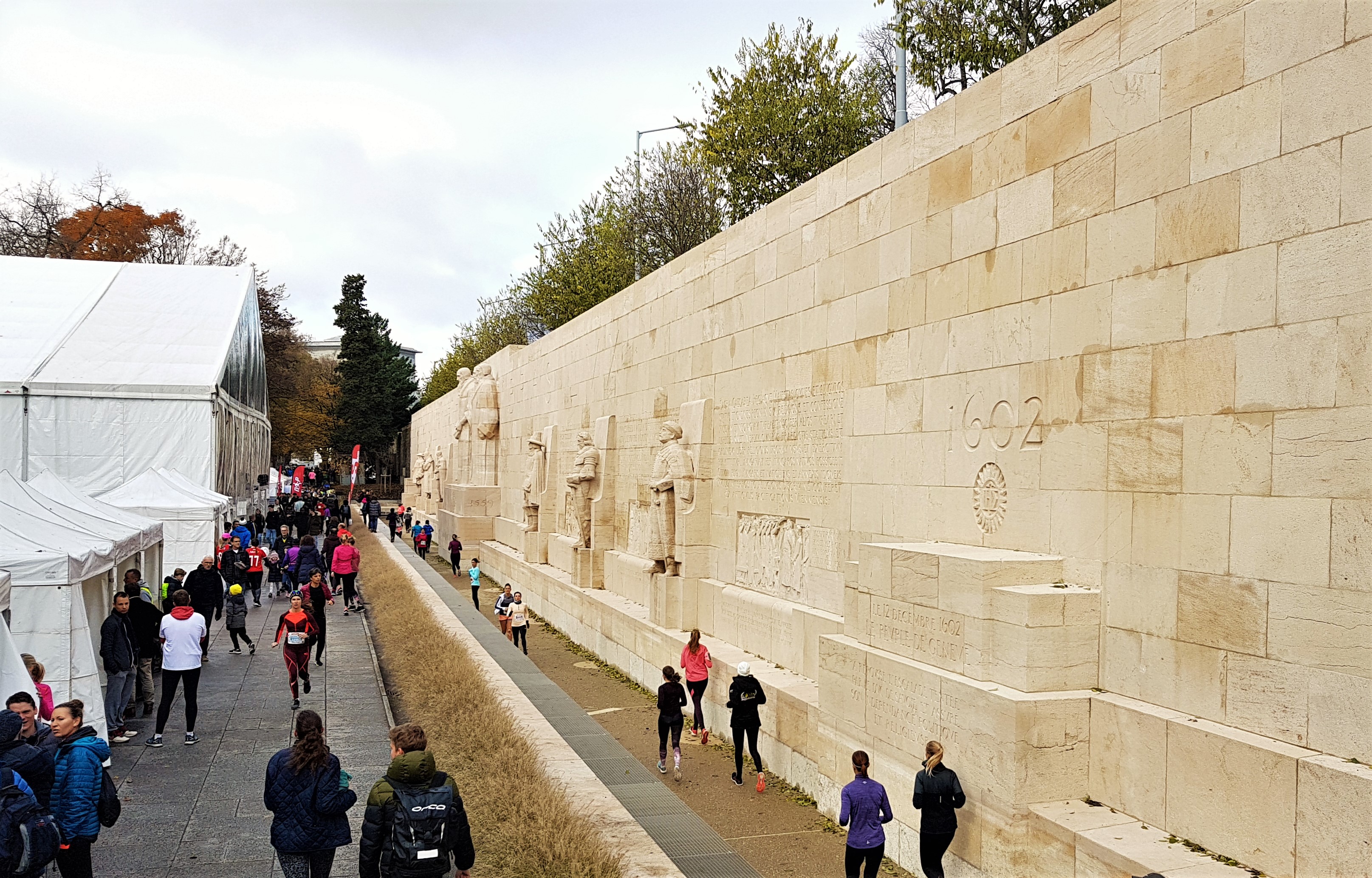 Enquanto passeávamos por esta parte da cidade, apercebemos-nos que um grande evento decorria durante este fim-de-semana -a maratona “Course de l’Escalade“. Como podem imaginar, devido à corrida, muitas das ruas estavam cortadas ou de difícil passagem e a quantidade de pessoas que ali se encontravam eram mais que muitas. No entanto, não nos podemos queixar de falta de animação. Junto ao muro dos Reformadores encontravam-se várias pessoas em aquecimento, onde havia muita música e animação. O monumento em si, o que tínhamos vindo efectivamente visitar, tem representado na sua parte central os quatro pioneiros da Reforma Protestante – Guilherme Farel, João Calvino, Teodoro de Beza e João Knox. Por baixo destas estátuas está gravado o símbolo ΙΗΣ que significa “Jesus Homem e Salvador”. O muro dos Reformadores encontra-se no Parque dos Bastiões, que infelizmente não conseguimos visitar muito bem devido a ser ali o local onde terminava a maratona.