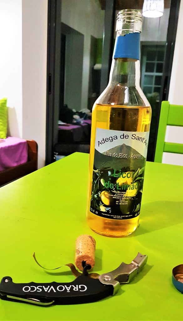 No dia em que chegámos como tinha sido um dia comprido, afinal tínhamos apanhado o voo de Inglaterra para Lisboa, depois de Lisboa para a Ilha do Pico que fez uma rápida paragem na ilha Terceira – acabámos por decidir ir comprar comida a um pequeno supermercado em vez de irmos a um restaurante. Encontrámos este supermercado relativamente perto de nós e ainda aberto – HIPERCAIS – e tal como miúdos comprámos todas as delícias portuguesas que não temos aqui em Inglaterra, como bacalhau com natas e lulas de caldeirada. Para experimentar algo da zona acabámos por comprar um licor de limão que era muito bom (e também muito forte).