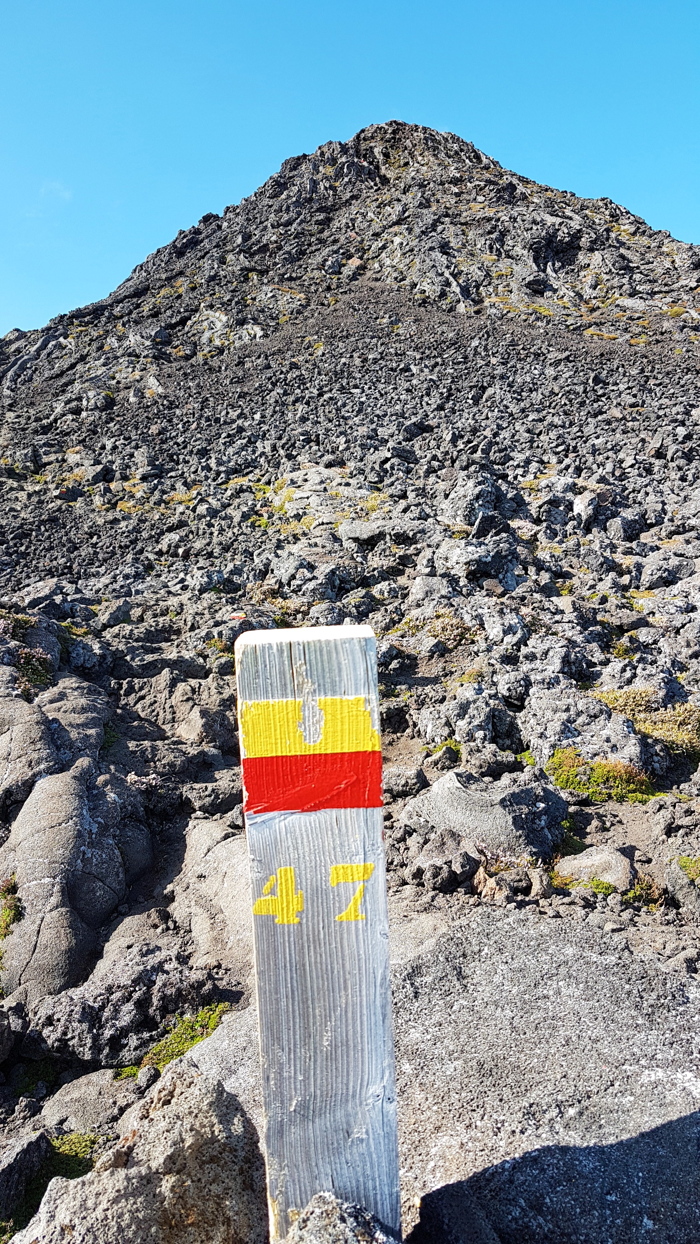 O percurso até ao cimo do Pico, o “Piquinho”, vai sendo acompanhado por estacas de madeira com números, são no total 47, que vão indicando o caminho e ainda bem que as estacas estão ali, porque ao contrário do que pensámos não há nenhum trilho por isso é mesmo subida à profissional. Ainda antes de nos termos metido nesta viagem li um pouco sobre a subida ao Pico e dizia que do número 1 ao 10 o trilho era mais fácil – não se enganem – não há zonas mais fáceis é tudo difícil. Também, talvez porque não somos alpinistas nem atletas a subida e descida que devem levar à volta de 7 horas a nós levou-nos 10 horas. Começámos às 11 e meia a subir, chegámos à caldeira 16:38, ao Piquinho (o ponto mais alto) às 17:04 e de volta à Casa da Montanha às 21:47.