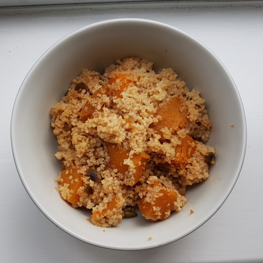 Junte a abóbora assada aos couscous, adicione o sumo de limão e retifique os temperos. Sirva polvilhado com as sementes de abóbora.