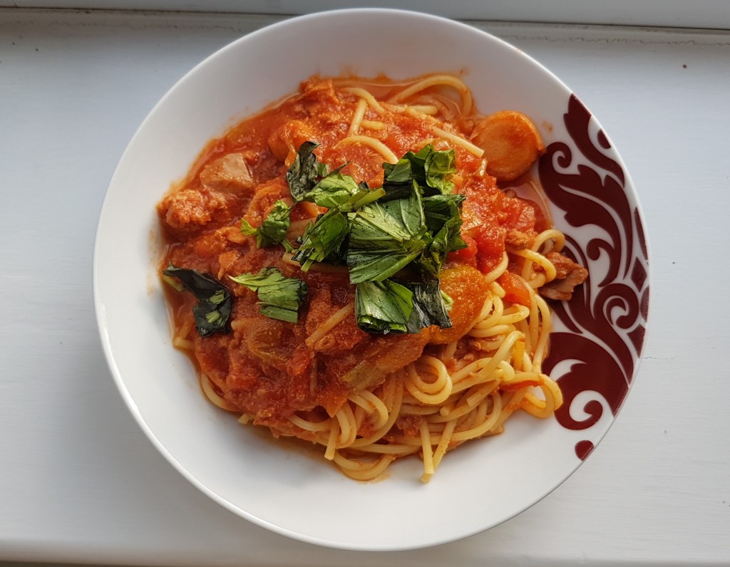Numa frigideira antiaderente aqueça o azeite, coloque o alho-francês e deixe cozinhar for cerca de 5 minutos, até ficar mole. Junte o tomate picado, 200 mL de água, o atum e misture. Tempere com sal, pimenta, alho em pó e o piri-piri. Quando começar a ferver, baixe o lume para baixo-médio e deixe cozinhar por cerca de 10 minutos. Quando a massa estiver cozida, escorra a água e junte-a ao molho de tomate. Misture. Sirva a massa decorada com folhas de manjericão e queijo ralado.