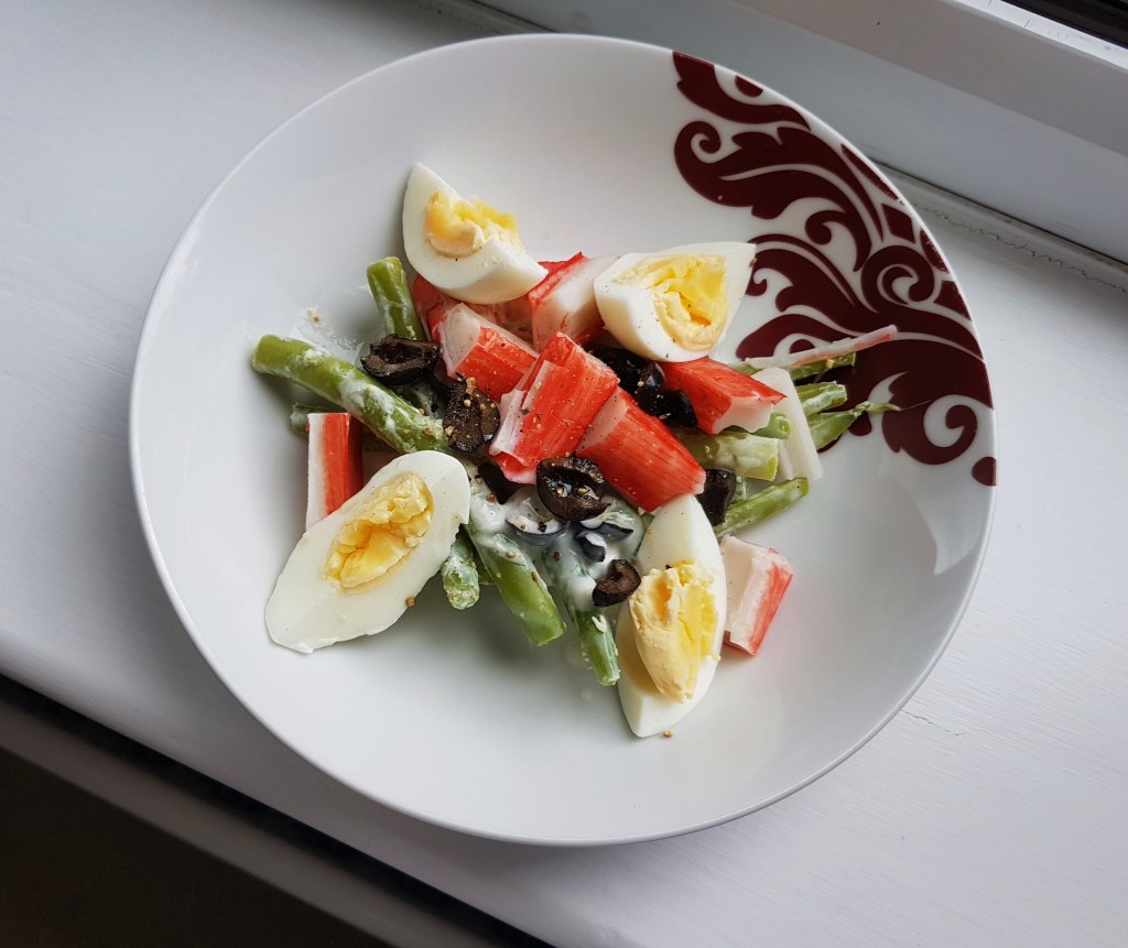 In a bowl place the natural yoghurt, add 10 of the chopped olives, a little vinegar and season with salt and pepper. Mix and add the green beans. Fold and separate the green bean mixture into plates. Place the sea delights and quartered eggs on top. Garnish with the remaining black olives, cut into slices or chopped and pepper. It’s ready to serve.