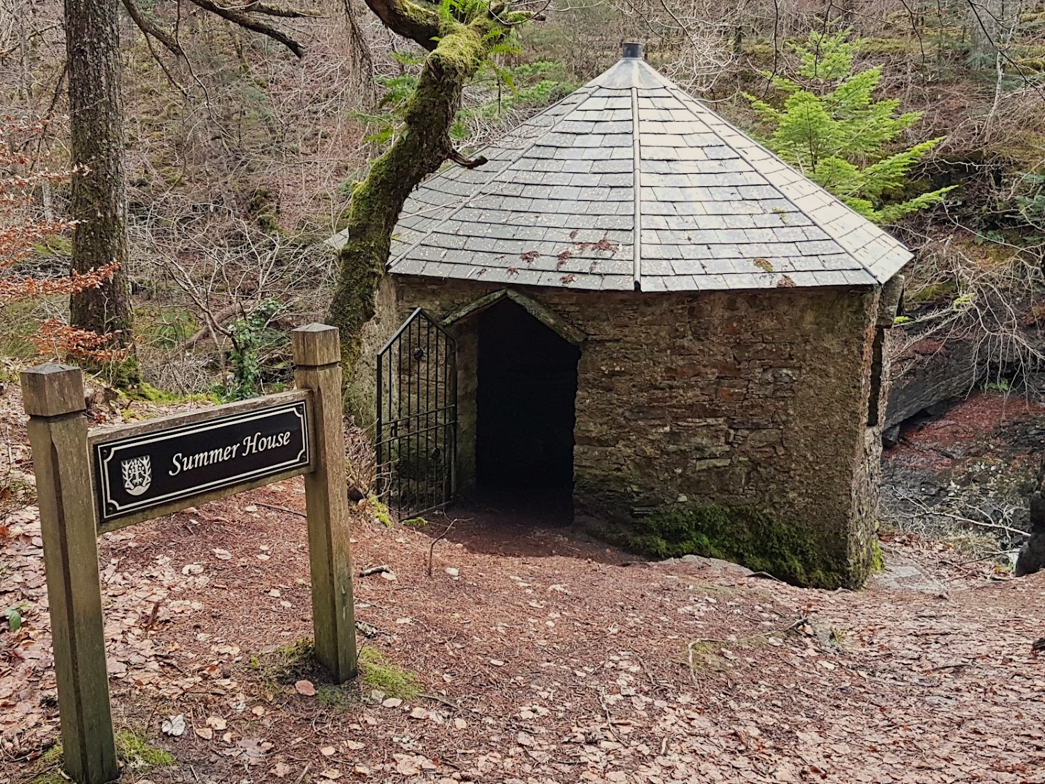 Descendo mais um pouco pelo lago fomos até à cascata de Invermoriston (Falls). Deixámos o carro no parque de estacionamento gratuito Invermoriston Falls. Para chegar até à cascata ou melhor até ao ponto panorâmico para a cascata embrenhámo-nos na floresta, e numa caminhada rápida de 5 minutos chegámos a uma casinha de pedra chamada “Summer House”. Daqui o panorama é muito pitoresco – a cascata, a ponte e a montanha ao fundo.