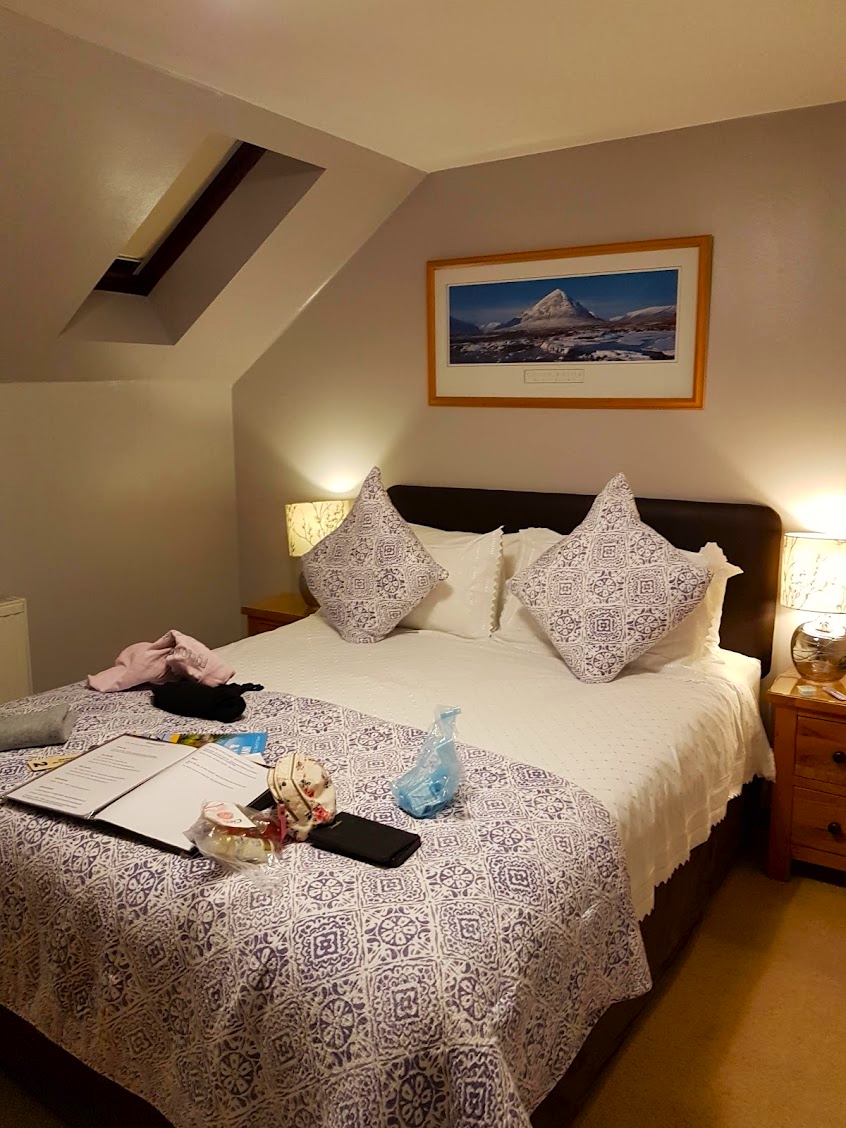 E nesta nota alta a noite chegou. Como disse acima, nesta altura do ano, anoitece bastante cedo, às 4 e meia já é completamente de noite. Fomos então em direção a Inverness, para o nosso alojamento – Dunhallin Guest House. Batemos à porta e os donos ao nos verem ficaram muito espantados. Então não é que se esqueceram que iam ter hóspedes naquela noite? Mas foram super prestáveis e simpáticos e numa rápida espera de 5 minutos estava o nosso quarto pronto. E um belo quarto, com espaço de estar com sofá e televisão. Achei bastante querida a decoração da casa-de-banho.