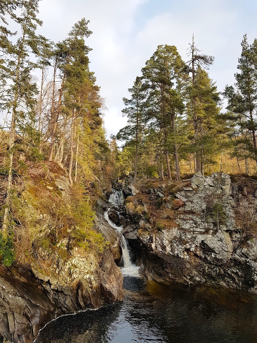 Em seguida fomos até à reserva natural Muir de Dinnet. Fomos parando pelo caminho onde achávamos que a paisagem merecia uma paragem para tirar fotografias e obviamente olhá-la com olhos de ver e não apenas de raspão. No entanto, demorámos quase cerca de duas horas das Falls of Bruir até à reserva natural Muir de Dinnet. Também aqui o GPS não foi grande ajuda, uma vez que no site oficial diz que os trilhos começam em “Burn o’Vat visitor center” mas quando se coloca este nome no GPS leva-nos a um local 8 milhas afastado do ponto onde se quer ir. Nós quando chegámos ao lugar onde o GPS indicava vimos logo que aquilo estava mal, visto que estávamos numa rua de casas residenciais e não havia quaisquer placas a indicar que fosse naquela zona o visitor center. Coloquem antes “Muir of Dinnet National Nature Reserve” que vão ter ao tal centro de visitantes de Burn o’Vat. Quando chegámos o centro de visitantes encontrava-se fechado, mas as casas de banho ainda estavam abertas. Seguimos primeiro pelo trilho para Burn O’Vat em direção a uma cascata escondida por pedregulhos. Apesar do trilho ser fácil e bastante pequeno, para terem acesso à cascata é preciso escalar pelas pedras e passar por um pequeno arco também ele de pedras.