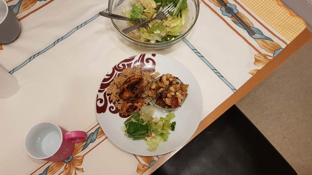 - Coloque uma chapa (grelhador) ao lume alto. Quando quente, baixe um pouco o lume e coloque os peitos de frango. Deixo-os cozinhar por cerca de 6-7 minutos de cada lado, virando-os uma vez. Se precisar corte um dos peitos de frango ao meio para confirmar cozedura completa do frango.