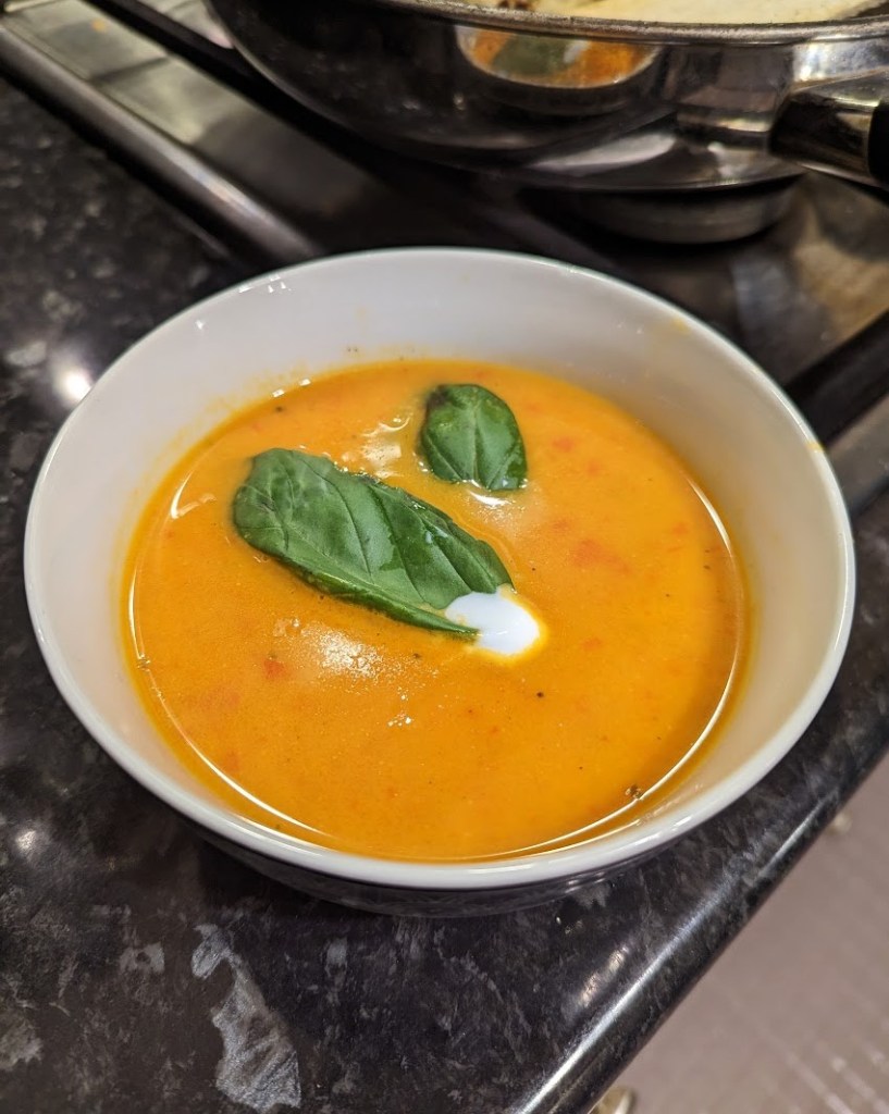 - Sirva a sopa com duas colheres de iogurte natural e decorada com folhinhas de manjericão.