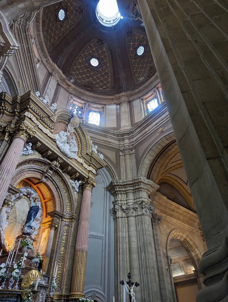 Primeiro local de paragem depois de partirmos da quinta das Pedras de Baixo foi a Igreja de Santa Maria Madalena. Esta igreja só se encontra aberta ao Domingo, mas na altura que lá passámos a missa estava no auge e não parece muito bem aos fiéis aparecerem turistas armados com camaras fotográficas a interromper o pai nosso ou a toma da hóstia. Esta igreja é um bom exemplo do Barroco, estilo mencionado acima incluindo o uso da telha dourada no seu interior. Da igreja tem-se uma imensa vista sobre a cidade, como um aperitivo do que viríamos a conhecer em breve.