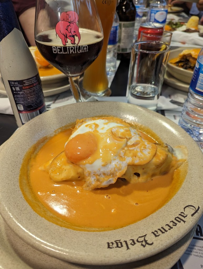 Primeiro aviso: vão cedo porque não aceitam reservas e quando saímos era para aí 8 e meia e havia uma fila enorme cá fora. Tínhamos ido cedo porque tinha sido esse o conselho de quem já tivera o prazer de experimentar a Taberna Belga. O principal prato aqui talvez sejam as francesinhas, mas também há outros pratos como pregos, bifinhos com cogumelo e hambúrgueres. Mas foi a seleção diversa de cervejas belgas que nos encheu os olhos para imediatamente escolhermos este local para última refeição em Braga. A única coisa que foi pena foi a falta de fome depois do grande almoço que tivemos na Adega Malhoa. Acabámos por só pedir meia francesinha, mas mesmo assim houve que não conseguisse marchar com tudo. Mas realmente foi uma pena porque foi uma das melhores francesinhas que comi na minha vida, aquele molho era simplesmente divinal.