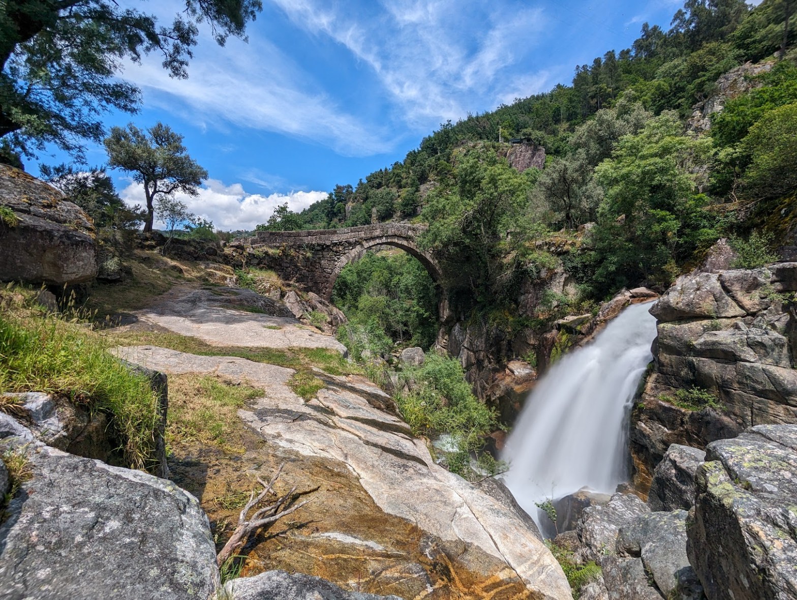 A ponte da Misarela foi um dos locais mais pitorescos que visitámos no Gerês. Uma paisagem digna de ser retrata vezes sem conta em fotografias e pinturas – a colina verdejante, a ponte de pedra com 13 metros de altura construída na Idade Média e a poderosa cascata.