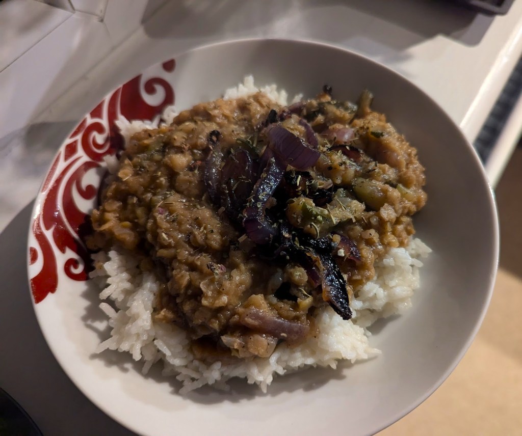 8. Sirva o dhal acompanhado com arroz branco e decore com a cebola frita.