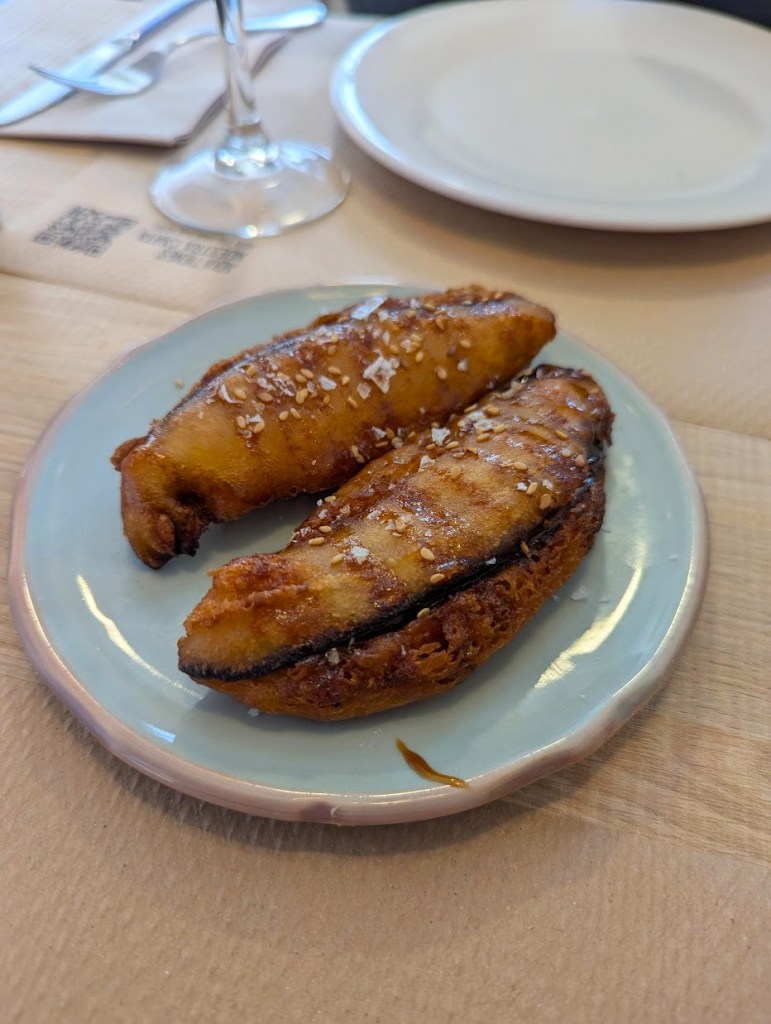 - Berenjenas califales rebozadas con reducción de vino dulce Pedro Ximénez y ajonjolí – beringelas fritas com molho doce: 5.25 euros