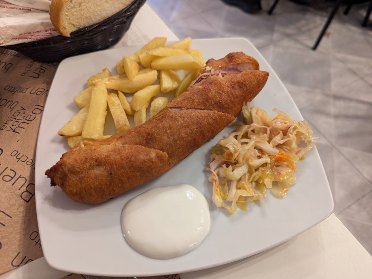Como não tínhamos muita fome decidimos pedir um prato e partilhar entre os dois. O que queríamos experimentar desde que tínhamos andado a pesquisar sobre pratos tradicionais era o flamequín, que consiste em lombo de porco enrolado em fatias de presunto e depois panado. Estávamos convencidos que íamos adorar. Havia várias versões deste prato neste restaurante, o tradicional ou o especial que se podia escolher com queijo Roquefort, com rabo de Toro ou a versão cordobés. Nós decidimos experimentar o flamequín cordobés.