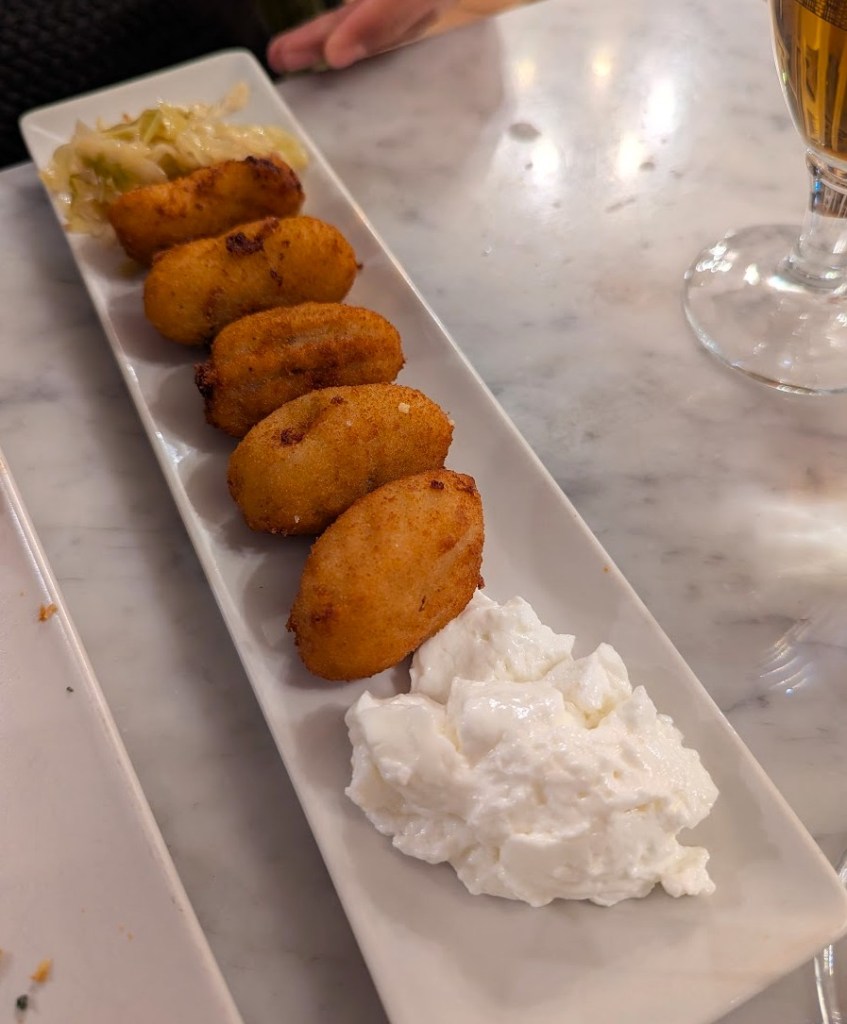 - Croquetas de jamón del puchero de la abuela con mayonesa de huevo frito – croquetes de presunto com maionese: 5,70 euros