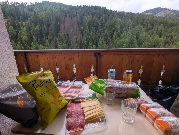 O jantar deste dia foi um pouco diferente. O dia tinha sido intenso com muitos quilómetros feitos a pé e a conduzir e por esta altura o cansaço começava a tomar as rédeas. Como não estávamos com muita vontade de pegar no carro, nem de procurar por mais restaurantes, adicionado ao facto de que tinha começado a chover, optámos pela escolha mais simples. Fomos ao supermercado que estava ao lado da Pensione Edelweiss e comprámos uma selecção de produtos para provar ao jantar. Mas atenção que normalmente caímos na tentação de comprar mais do que aquilo que conseguimos comer. O que foi o que aconteceu. Mas se isto for também comum para vocês, não deitem a comida fora. Façam antes como nós, comam o que não podem guardar e o resto usem-no para o almoço do dia seguinte.