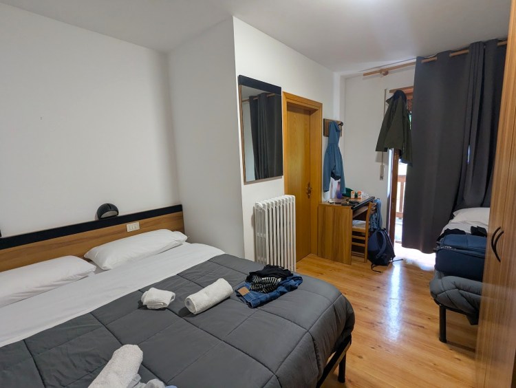 A distância entre o Lago d’Alleghe e a nossa acomodação era de 14km e por isso a viagem foi de mais ou menos 20 minutos. Fizemos o check-in e durante este processo a recepcionista disse-nos com grande orgulho que a nossa reserva tinha tido um upgrade e que por isso ficaríamos num quarto com varanda. Eu claro agradeci. Mais tarde reparei que a maioria dos quartos tinham varanda, mas tenho a certeza de que havia quartos sem varanda. E a varanda deu-nos jeito. Por isso pronto, ponto positivo.