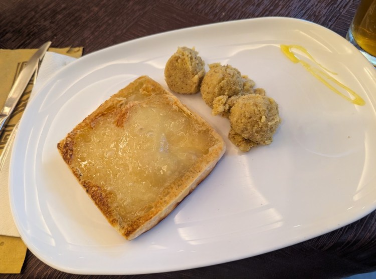 Infelizmente não posso dizer o mesmo dos pratos principais. O meu marido pediu a cotoletta alla milanesa (costeleta de porco panada) com batatas fritas e eu para experimentar pedi formaggio Dobbiaco alla piastra que é uma espécie de bloco de queijo frito. A cotoletta alla milanesa, de acordo com o meu marido, estava boa, mas era um prato bastante simples. Quanto ao meu estava horrendo. Acho que nunca tinha comido um prato tão mau num restaurante. O queijo devia ter sido frito num óleo que já tinha sido muito usado e, portanto, queimado, dando um gosto extremamente amargo ao queijo. Foi uma das piores coisas que já comi na minha vida. Mas devia ser do óleo usado porque mais tarde vi uma senhora a comer o mesmo prato e não parecia queixar-se, bem pelo contrário.
