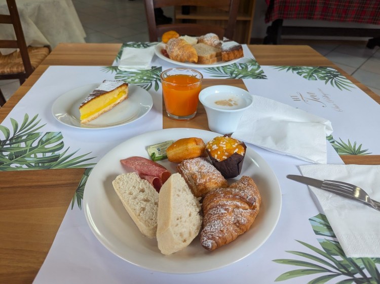 Daqui vou saltar no tempo e falar já do pequeno-almoço do dia seguinte. Então o pequeno-almoço era servido das 7 às 9 da manhã. Como hoje era um dia mais calmo para nós, sem trilhos no itinerário, pensámos que era uma boa ideia irmos tomar o pequeno-almoço às 8 e meia. Aproveitar e ficar mais um bocadinho na cama.