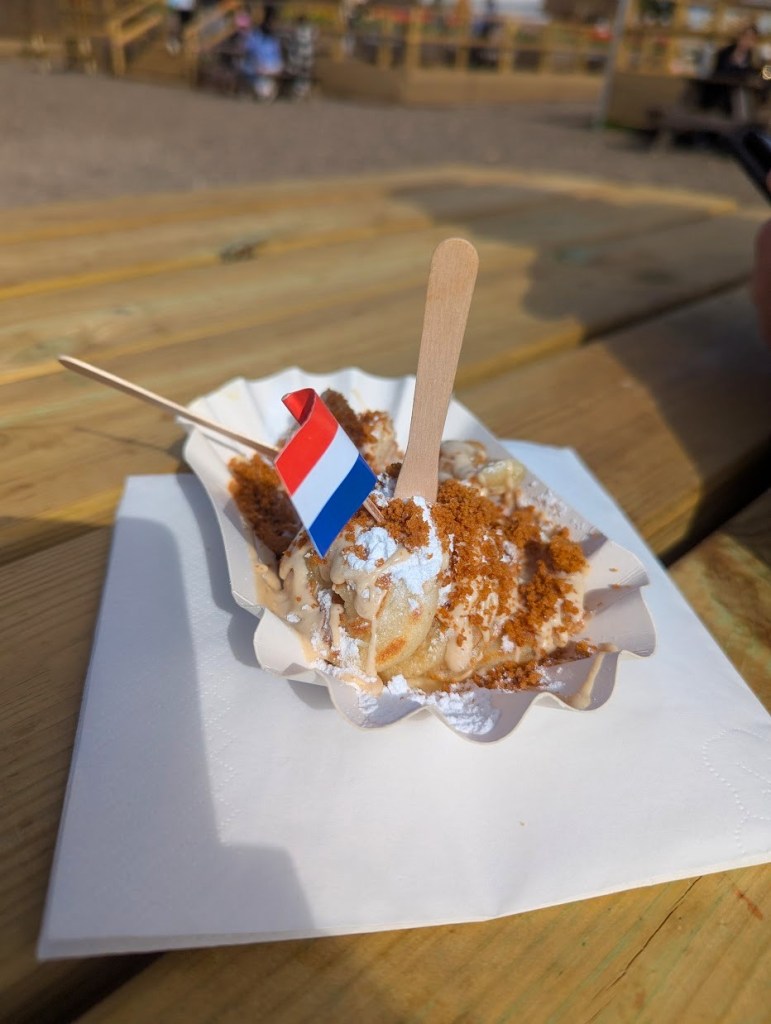 Para comer eu já tinha escolhido o que queria ainda antes de sair de casa. Queria experimentar as panquecas pequeninas típicas dos Países Baixos, os Poffertjes. Fomos à barraquinha pedir 6 panquecas com molho kinder bueno e esfarelado de bolacha. Como não contámos que também levava açúcar em pó por cima, acabou por ficar bastante doce, se fosse agora tinha escolhido apenas com sumo de limão. Mas valeu a pena, foi como um mimo que ofereci a mim mesma. Enquanto comíamos sentados numa das mesas perto do moinho, reparámos nos dois rapazes que andavam a cantar e a tocar viola pelos vários corredores de flores. Por isso também havia música ao vivo, mas de uma forma menos convencional.