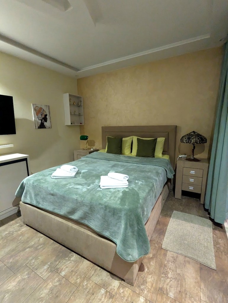 Depois de fazermos o check-in e de ficarmos a saber que tínhamos pequeno-almoço incluído com a reserva, entrámos no nosso apartamento. O apartamento ficava num edifício individual com direito a uma pequena varanda e jardim. O apartamento era constituído por uma cozinha, uma casa-de-banho e pela cama na zona que fazia de quarto. Tudo muito limpo, remodelado, e bem decorado. Como tinha estado a chover, infelizmente não conseguimos dar um uso apropriado à zona exterior, mas da parte interior podemos dizer que era muito confortável. Esta é certamente uma das nossas recomendações para ficar em Podgorica.