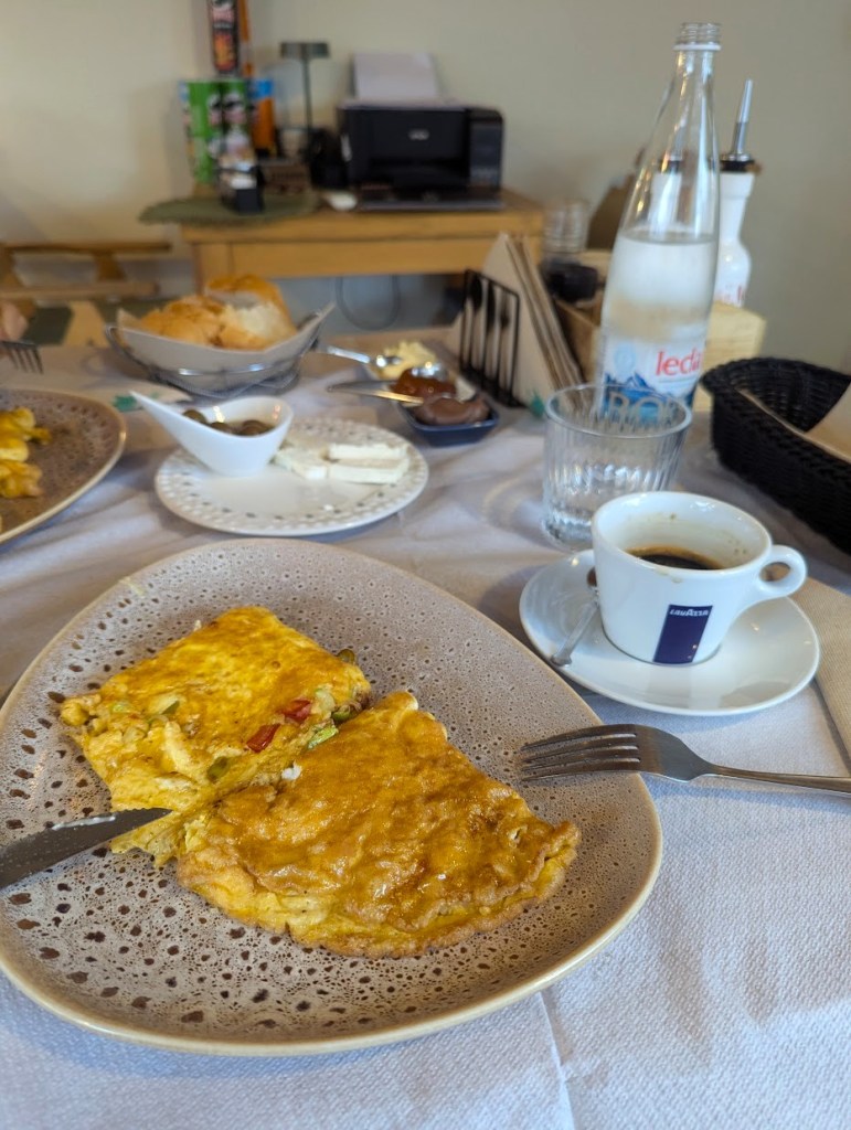 O pequeno-almoço seguiu uma dieta mediterrânea com um pratinho de azeitonas verdes e sumarentas, fatias de queijo de cabra e omeletes que eu pedi de queijo e o meu marido de vegetais que dividimos entre os dois.