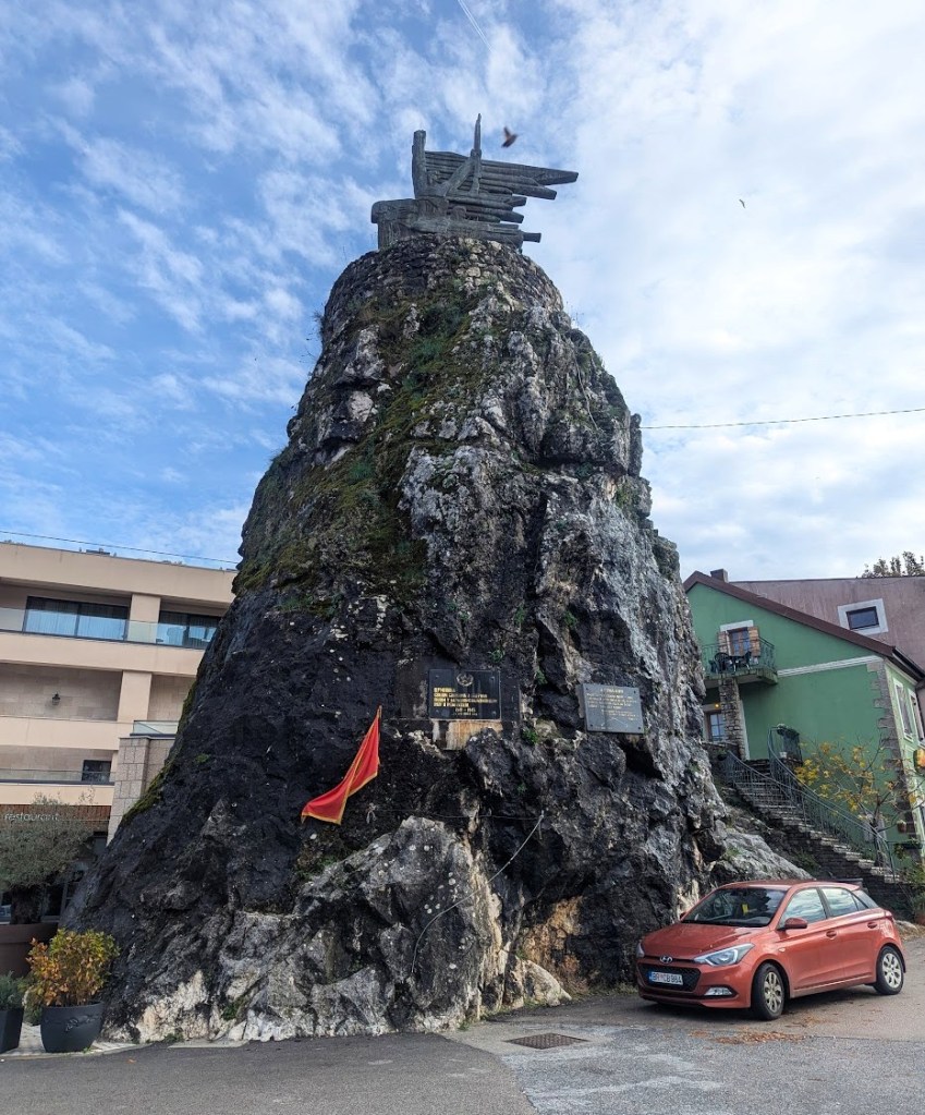 Esta foi uma das situações mais caricatas que tivemos em Montenegro. O ponto onde queríamos ir chama-se ‘Poselijani-vandfaldet’ onde supostamente há uma cascata, uma ponte antiga e algumas casas. Mas afinal a estrada para onde tínhamos de virar tinha o símbolo de trânsito proibido. Para decidirmos o que fazer a seguir parámos o carro junto ao ‘monumento ai caduti’.