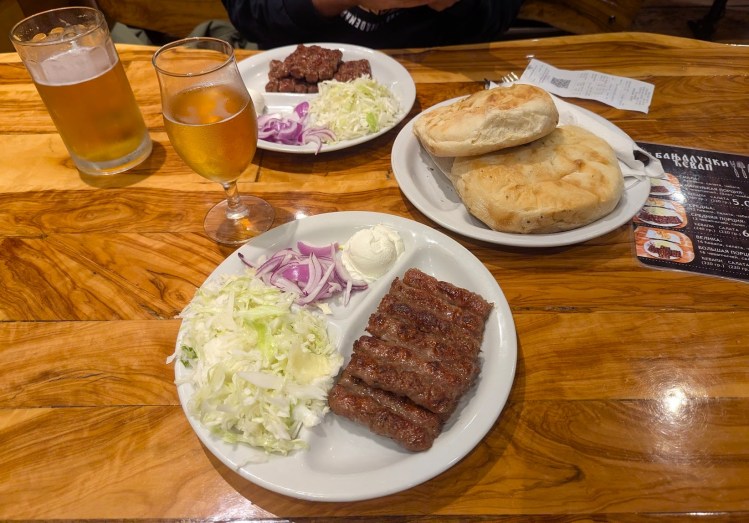 Como a primeira opção para jantar estava fora do baralho decidimos experimentar outro restaurante, o Banjalučki Ćevap. Era um pouco mais longe, mas pelo caminho fomos passando por alguns restaurantes que estavam abertos e que podiam ser opções se também encontrássemos a porta deste fechada. Contudo desta vez acertámos, não só estava aberto como havia mesas livres. O menu é bastante reduzido já que só há um prato e o que muda é apenas o tamanho, mas vale a pena vir aqui. O prato tradicional disponível é o cevapi, carne picada grelhada em forma de salsicha. Comemos cevapi em outros locais durante a viagem, mas o melhor foi daqui. Há 3 diferentes menus, um que traz 8 cevapi a 5 euros, ou 12 cevapi a 6.50 euros ou o maior com 16 cevapi a 7.50 euros. A carne vem acompanhada com couve branca picada, cebola roxa, um molho que penso ser sour cream e um pão que era absolutamente divinal.