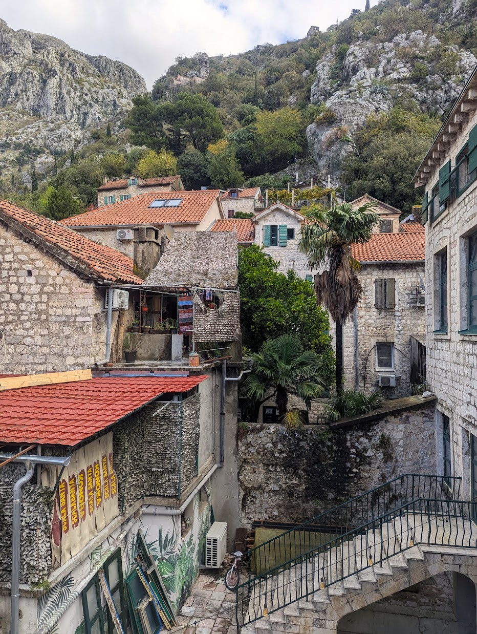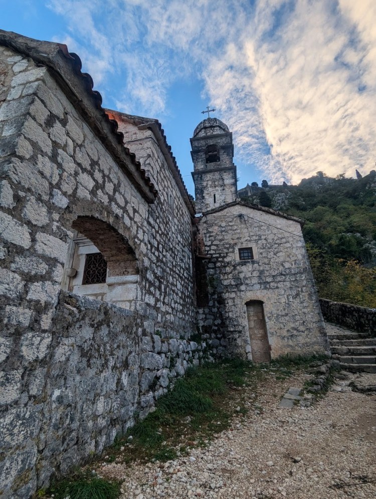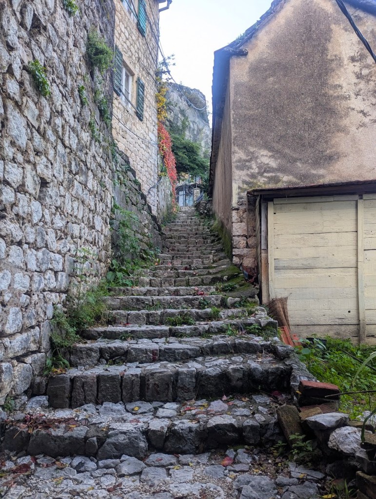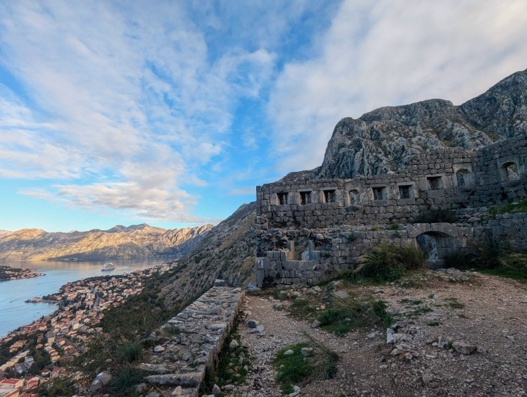 Há um caminho que começa nas traseiras do centro comercial Kamelija e que sobe pelo lado detrás da fortaleza sendo a paisagem mais virada para as montanhas do que para a cidade. A certo ponto vão encontrar uma escada que sobe para a fortaleza sendo a entrada feita por uma pequena abertura, uma espécie de janela. Depois para voltar para trás têm de fazer o mesmo caminho senão vão encontrar a cancela onde se faz o pagamento. Podem também fazer como nós, ou seja, começar a subida antes das 8 da manhã e depois voltar pelo trilho usando a tal escada. Enquanto pesquisava o que fazer em Kotor li em alguns locais que a escada tinha sido removida, mas eu vi a escada quando passei por aqui em novembro de 2025.