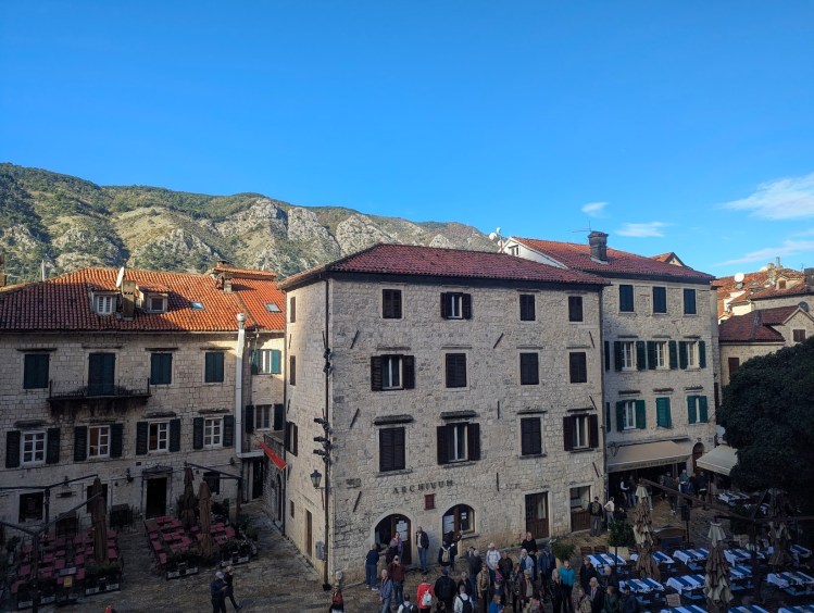 Quando chegámos de volta ao centro de Kotor a cidade estava completamente mudada ou melhor, apinhada. Era pessoas por todo o lado. Quando começámos a subida tínhamos reparado (difícil de não o fazer) num cruzeiro que entrava pela baía de Kotor e que mais tarde atracou no porto. Pois eram as pessoas que vinham nesse cruzeiro que agora enchiam as ruas da cidade.