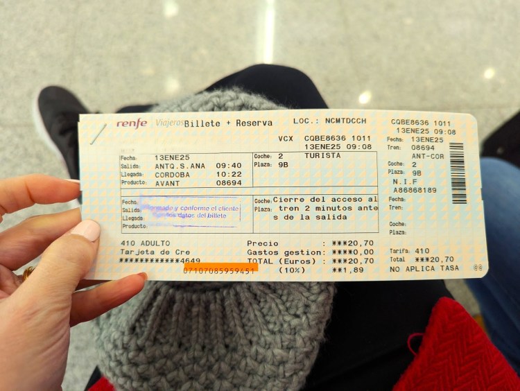 Foi por isso que na segunda-feira de manhã acordámos bem cedo e às 7 e meia já estávamos a chegar à estação de comboios de Ronda. Comprámos os bilhetes do primeiro comboio na segunda-feira de manhã, não na noite anterior em caso de não acordarmos a tempo, e depois os bilhetes para Córdoba na estação de Antequera-Santa Ana. Como havia uma diferença de meia hora entre a chegada de um e a partida do outro comboio não houve problemas em fazer assim.