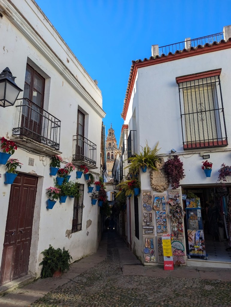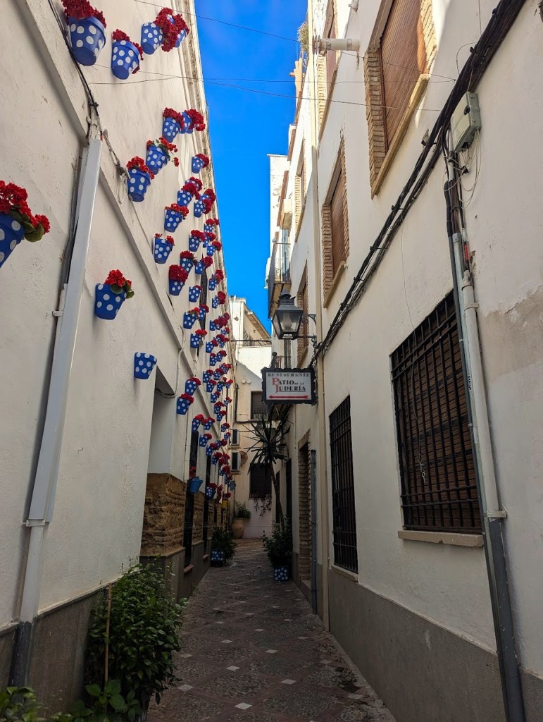 Apesar de não termos visitado Córdoba durante o festival em maio, encontrámos mesmo assim muitas ruazinhas decoradas a rigor. Duas das ruas que vale a pena mencionar é a Calleja de Los Ángeles, a qual visitámos por acaso quando estávamos de passagem e a Calleja de las Flores que é possivelmente a mais conhecida, até porque foi várias vezes mencionada como a rua mais bonita de Córdoba. Nesta ruazinha, depois de se passar por baixo do arco, chega-se a um pequeno pátio sem saída. Se olharmos para a entrada da rua conseguimos vislumbrar a torre da famosa Mezquita-Catedral de Córdoba.