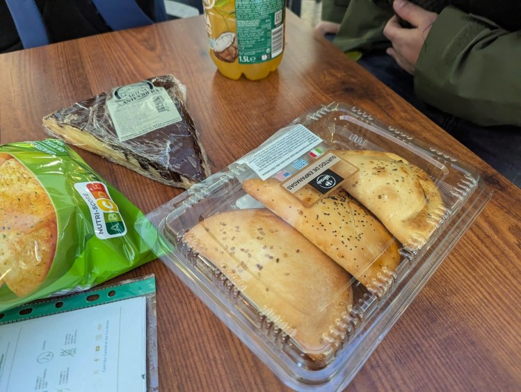 Depois de uma volta ou duas nos corredores comprámos uma caixa com 3 empanadas, um pacote de batatas fritas dos grande e uma garrafa de sumo. Confesso que acabou por não ser nada muito local até porque os recheios das empanadas eram de cozinhas bastante diferentes: Greca, Italiana e Americana. Mas claro que este pitéu nos soube pela vida e depois de umas dentadas já conseguíamos sentir o nosso corpo a mudar fisicamente e mentalmente. Como normalmente acontece comprámos demasiada comida até porque também comprámos sobremesa. O doce escolhido foram umas Cuñas Artesanas de Chocolate que é feito de um bolo muito fofinho recheado com creme de baunilha e coberto com molho de chocolate, doce típico de Sevilha. Viram? Sempre comprámos alguma coisa da zona que não conheceríamos se não tivéssemos vindo ao supermercado.