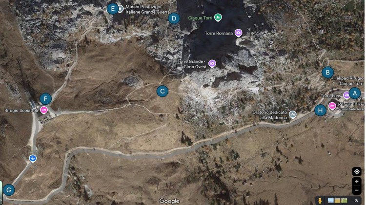 Estacionámos o carro perto do Rifugio 5 Torri (ponto A) e subimos o trilho de terra que ia ter a um cruzamento (ponto B). Aqui virámos à esquerda até ao próximo cruzamento (ponto C) de onde se via o Rifugio Scoiattoli. Virámos neste cruzamento à direita (as Cinque Torri ficavam à nossa direita até ao ponto panorâmico (ponto D). Fomos descendo e seguindo os caminhos de terra e escadas, passámos por vários locais da Primeira Guerra Mundial (Ponto E). Depois subimos até ao Rifugio Scoiatolli (ponto F) e seguimos pela estrada principal até chegar ao cruzamento (Ponto G). Aqui virámos à esquerda e descemos pela estrada larga de volta ao Rifugio 5 Torri.