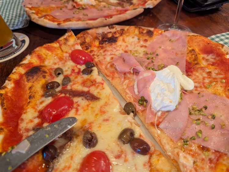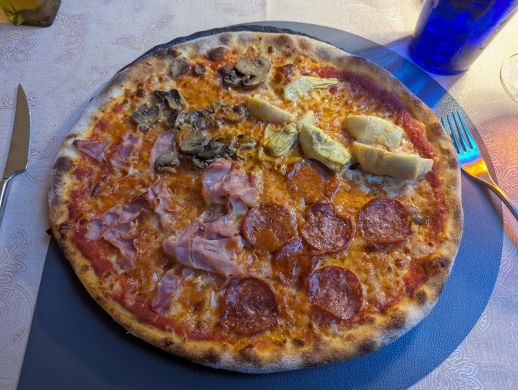 Quando fomos para o carro liguei para o restaurante-pizzeria Rosa Nera que confirmou não só que estavam abertos como tinham mesas livres. E a diferença no serviço notou-se mal entrámos. Talvez a pior parte seja o parque de estacionamento que basicamente é inexistente. Mas a atmosfera do restaurante foi muito mais acolhedora, mesmo com as mesas cheias de pessoas que pareciam ser residentes dali.