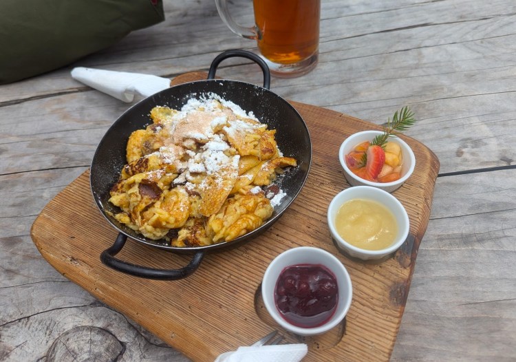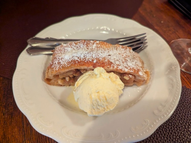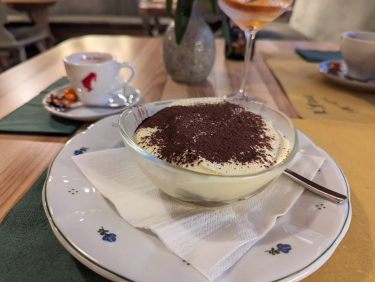 Nesta região a comida local atravessa fronteiras dando a possibilidade de ter uma refeição com pratos italianos e austríacos.Para beber pedimos um aperol spritz e uma cerveja local. Fica aqui a dica que os cocktails tal como o aperol spritz são mais baratos que a cerveja. E para comer pedimos: