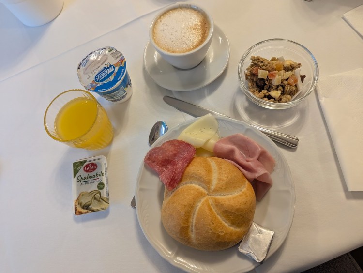 Como no início da viagem pensávamos que tínhamos de sair de manhã muito cedo (de acordo com o que tínhamos lido sobre os Dolomitas) e como o pequeno-almoço só começava às 8, a dona da pensão e a filha concordaram em deixar-nos o pequeno-almoço num saco para o irmos buscar à recepção quando saíssemos. E das duas vezes que o fizeram os sacos vinham bem recheados com 4 sandes (2 para cada um, e cada uma feita com um tipo de pão diferente), 2 fatias de bolo e 2 sumos. Depois dos dois primeiros dias apercebemo-nos que não era preciso acordar assim tão cedo nesta altura do ano e a partir do terceiro dia já tomávamos o pequeno-almoço na pensão antes de sairmos. Mas aquele pequeno-almoço empacotado deu-nos imenso jeito já que com toda aquela comida não era só pequeno-almoço mas também almoço.