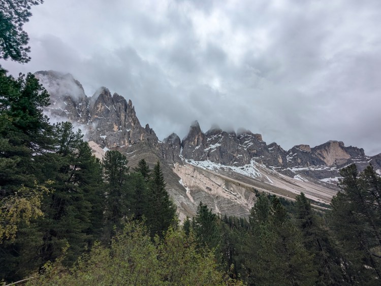 Infelizmente a chuva recomeçou e caia de tal forma que quando estávamos a passar pelo Rifugio Piz Sorega até ponderei se não deveríamos ficar ali um bocado até o tempo melhorar. Era chuva forte, vento e um céu de meter medo. Mas a ideia não foi aceite pela equipa (aka o meu marido). Portanto foi entre episódios de chuva e ‘não chuva’ que descemos o trilho 21 até San Cassiano.