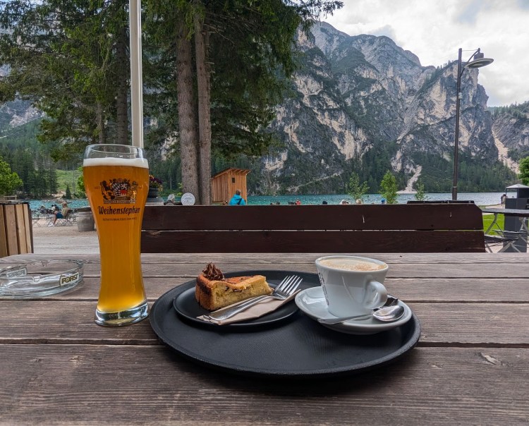 Acabámos por chegar ao Lago di Alleghe perto das 3 e meia. Estacionámos ao lado do Parque Centrale onde havia um pequeno parque exterior, este gratuito. E esta era a localização ideal parar parar no Alleghe Beach Chiosco Bar e sentarmo-nos à esplanada com vista para o lago.