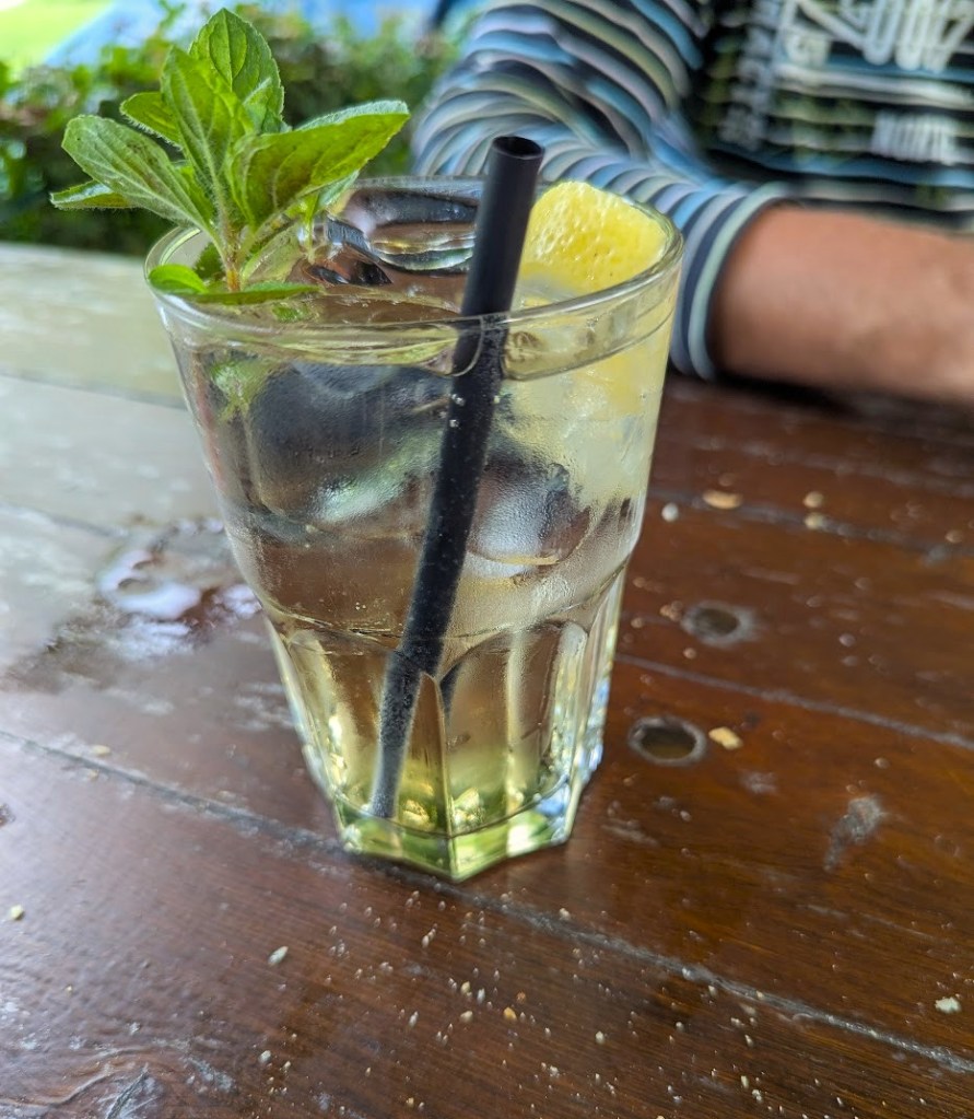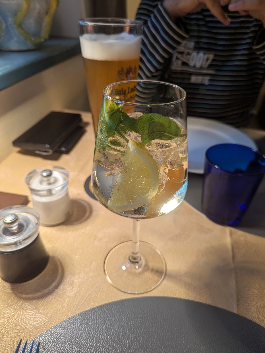 De todo os lugares onde estivemos durante o dia, este foi onde passámos mais tempo. Pedimos duas rodadas de bebidas que incluíram cerveja, Midori Spritz e Hugo Spritz. Tivemos de nos ficar pelas duas bebidas pois ainda tínhamos um longo caminho até ao aeroporto. A meio pedimos uma sandes para dividir já que o jantar seria só no aeroporto.