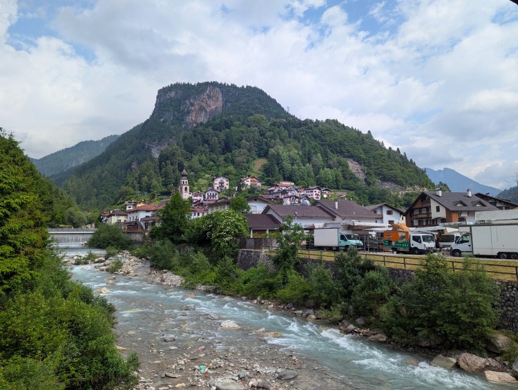Esta paragem foi feita depois de conduzirmos por meia hora desde TEA San Pellegrino. Não houve uma razão específica para pararmos aqui sem ser termos achado esta vila (?aldeia) pitoresca. Deixámos o carro no Parcheggio Lago del Ghirlo que por sinal era gratuito e fomos em direcção ao centro. O que encontrámos em Cencenighe Agordino foi uma bonita vila rodeada por montanhas e acompanhada por um ribeiro. Como era Sábado, quando atravessámos uma das pontes que passam por cima do rio fomos dar ao mercado. Demos uma volta por ali a ver o que estava a ser vendido nos tendeiros indo depois até à igreja ‘Chiesa Parrocchiale di Sant’Antonio Abate’. A igreja infelizmente estava fechada por isso não pudemos visitá-la.
