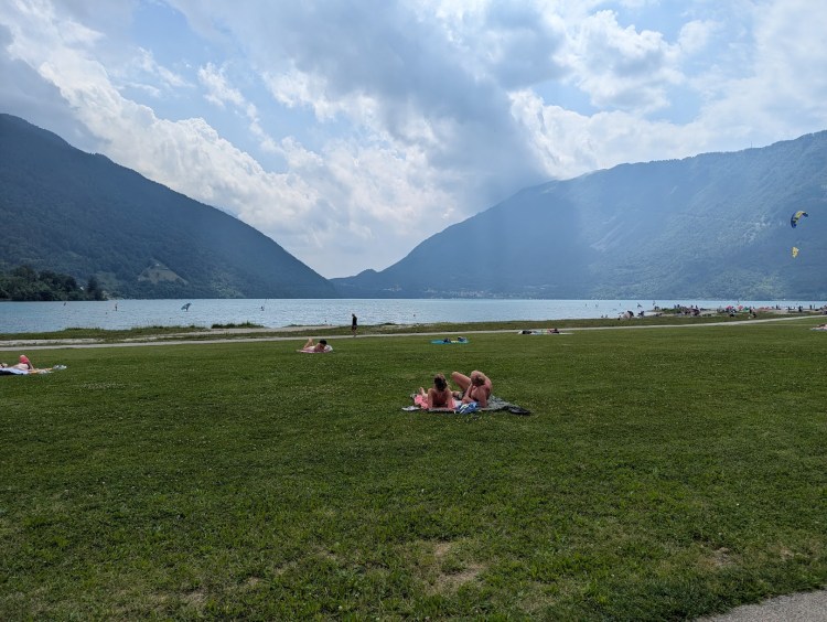 Antes de irmos até ao lago fomos passear pela vila, mas esta parecia deserta. Os restaurantes, cafés e padarias pareciam estar fechados e não se via vivalma. Isto mudou quando chegámos ao lago, mais especificamente à praia da Farra. Havia imenso pessoal deitado nas toalhas, ou a fazer windsurf (prancha e vela) ou kitesurf (prancha e parapente).