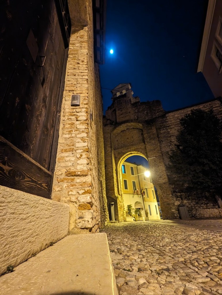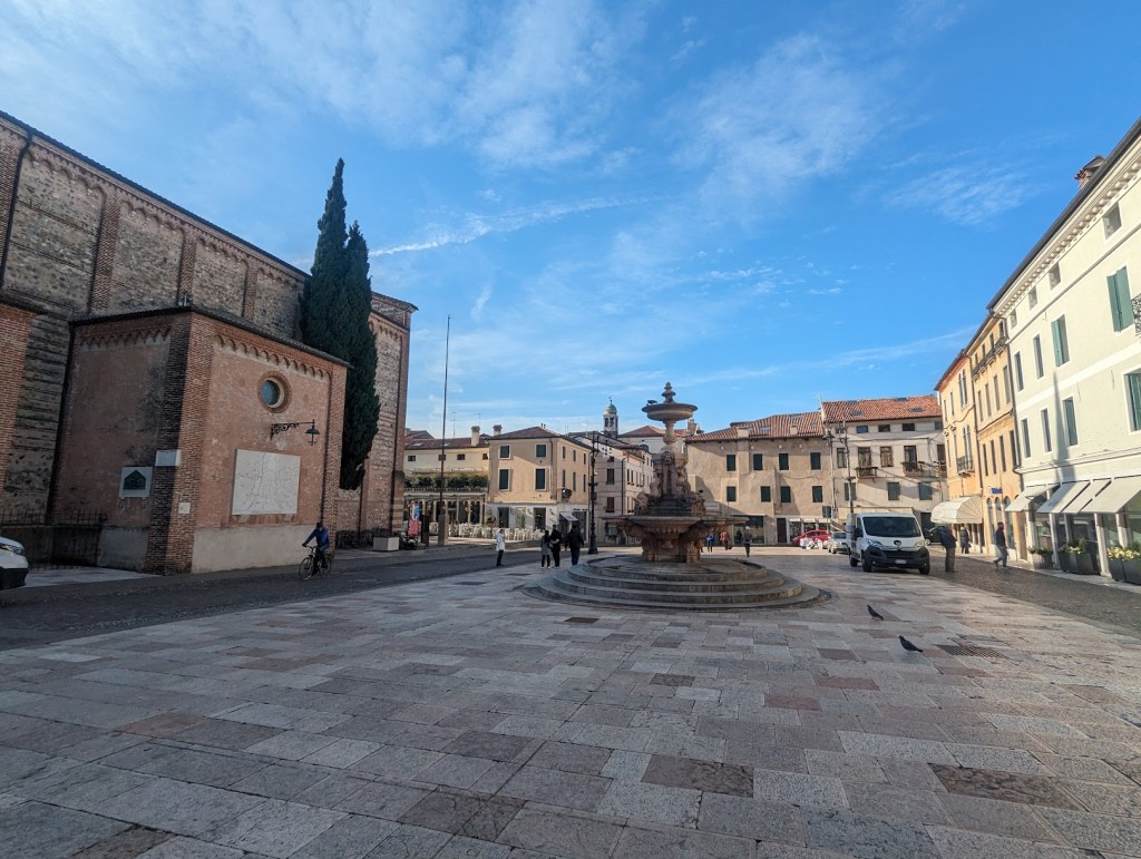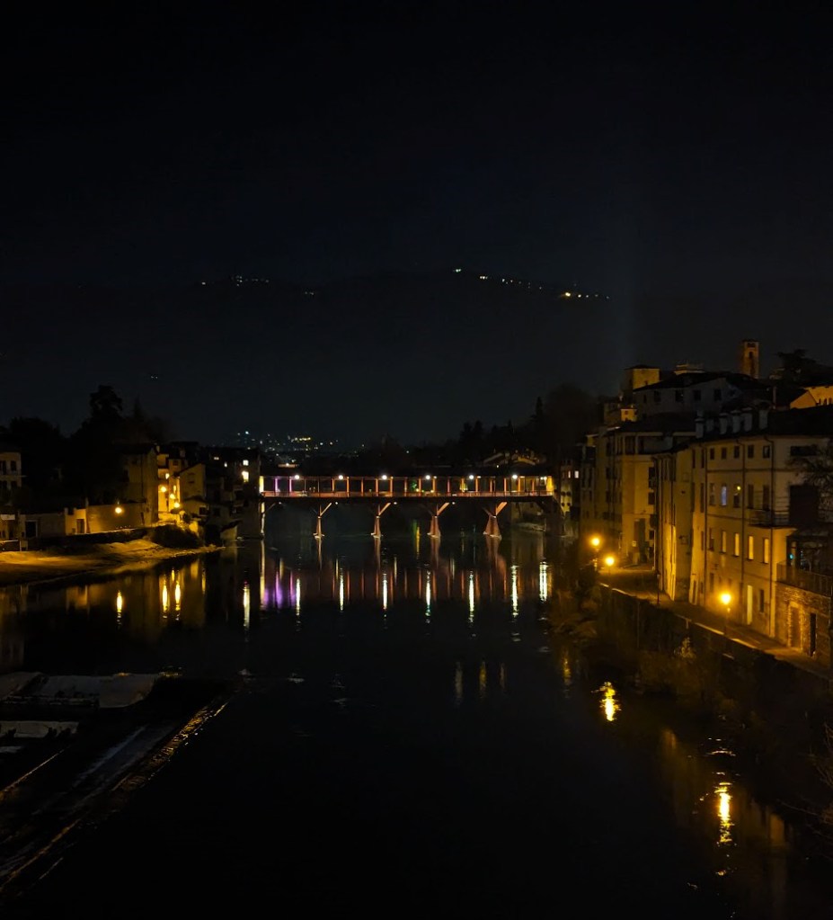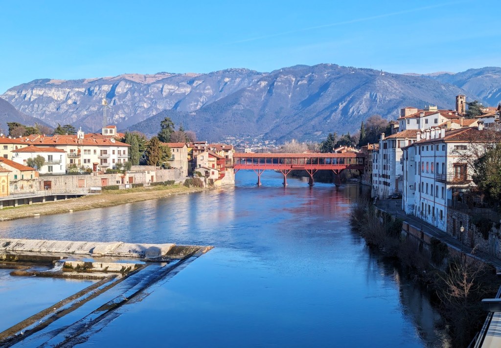 Depois da refeição fomos explorar o centro de Bassano. O ponto mais alto, e o mais conhecido, é a Ponte Vecchio (Ponte degli Alpini) e a maravilhosa vista sobre as montanhas, o rio Brenta e a arquitetura da cidade. O mais incrível é que a vista não tem pessoas, uma paisagem aberta para adoradores e até não adoradores da natureza. A ponte feita de madeira já foi destruída e construída múltiplas vezes, algumas destruída devido a cheias, outras por mão humana e isto desde 1124! Em 1567, Andrea Palladio, um famoso arquiteto da época construiu a ponte tal como ela hoje se apresenta. Apesar de ter sido destruída e construída depois de 1567 foi sempre reconstruída seguindo a arquitetura original de Andrea. O seu nome ‘degli Alpini’ é uma homenagem aos Alpini, as tropas da montanha, que em 1948 reconstruiram esta ponte depois de ser destruída por uma bomba durante a segunda guerra mundial. As últimas obras de restauração aconteceram em 2021.