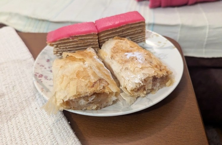 Poucos minutos depois de chegarmos ao apartamento a mãe da senhoria veio bater-nos à porta com nem mais nem menos um prato na mão com 4 bolos. Era a sua forma de nos agradecer por termos limpo a lareira de manhã e a abastecido de lenha. Na verdade, quem o fez foi o meu marido enquanto eu me arranjava. Nem imaginam o quanto fiquei agradecida, afinal ia comer bolo e ainda para mais em frente à lareira que nesta altura já estava acesa. Acabou por ser bem melhor do que em qualquer pastelaria.