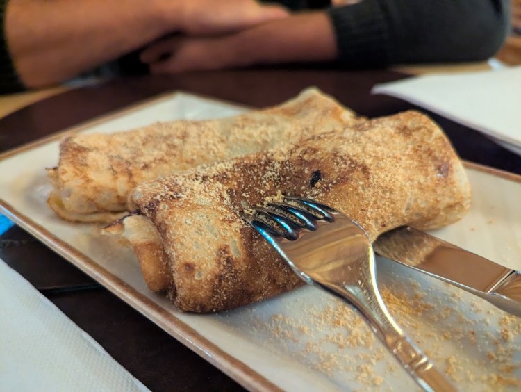 Ao contrário da noite anterior não pedimos entradas para termos espaço para a sobremesa. Da lista pedimos as panquecas recheadas que apesar de saborosas estavam um pouco secas tornando-se um pouco pesadas para final de refeição. Também se pediu Rakija como digestivo. Apesar de nos termos apaparicado um pouco mais com doce e bebida, preferimos a refeição da primeira noite.