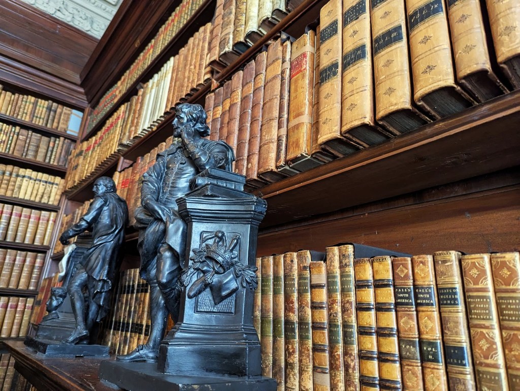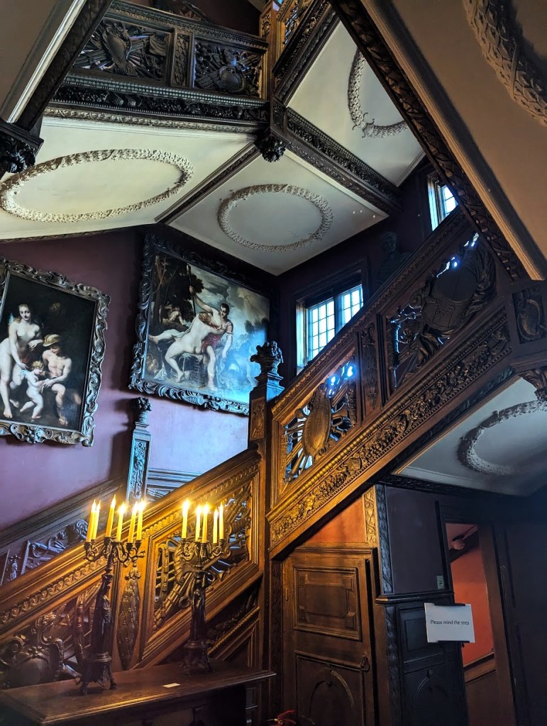 Quando subimos ao piso superior chegámos a uma grande sala onde em destaque se encontrava o quadro pintado como celebração do casamento dos duqueses de Lauderdale em 1672. Em seguida fomos passando por várias salas algumas decoradas com tapeçarias outras com vários quadros até chegarmos à biblioteca, também ela adicionada como parte das renovações. Nesta sala para além dos esperados livros também se encontravam alguns mapas e globos que mostram como na época se pensava ser o mundo. A certa altura voltámos a descer para o piso do rés-do-chão e depois para outro piso abaixo onde se encontravam os aposentos dos empregados.