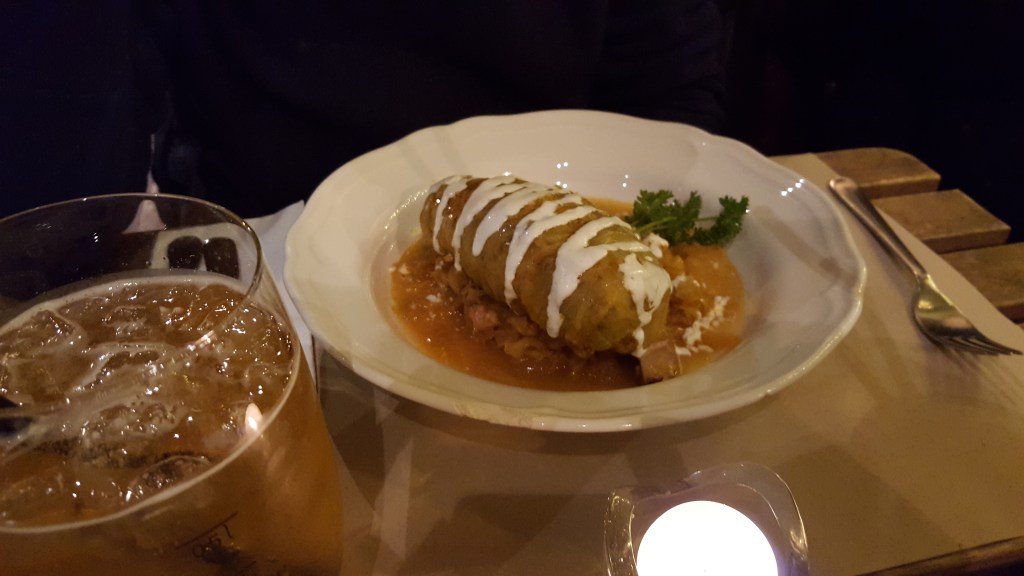 Nós numa das vezes que tínhamos ido em direcção ao hotel, tínhamos reparado num restaurante que tinha preços bastante acessíveis. Como nós queríamos experimentar comida tipicamente húngara, acabámos a jantar neste restaurante, o Puli. Eu pedi frango paprikash com dumplings e o meu namorado pediu Toltott Kaposzta que é couve recheada com carne. O que tenho eu a dizer em relação à comida? O meu não tinha sal e o do meu namorado tinha sal a mais. Não foi assim uma experiência que diga que gostaria de repetir. Talvez pedir a mesma comida sim, mas noutro restaurante. O que até nos admirou porque o restaurante estava cheio.