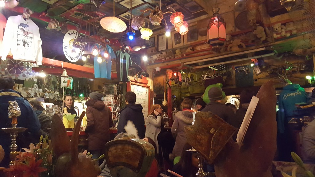 Com isto tudo já eram quase 7 horas da noite (na verdade aqui escurece bastante cedo nesta altura do ano, às 4 e meia já começa a anoitecer). Como não íamos jantar decidimos tentar ir a um ruin bar. Ruins Bars são bares construídos em edifícios e lojas abandonados durante a 2ª guerra mundial. Nós decidimos ir ao Szimpla Kert, o mais perto do nosso hotel. Estava lá imensa gente.