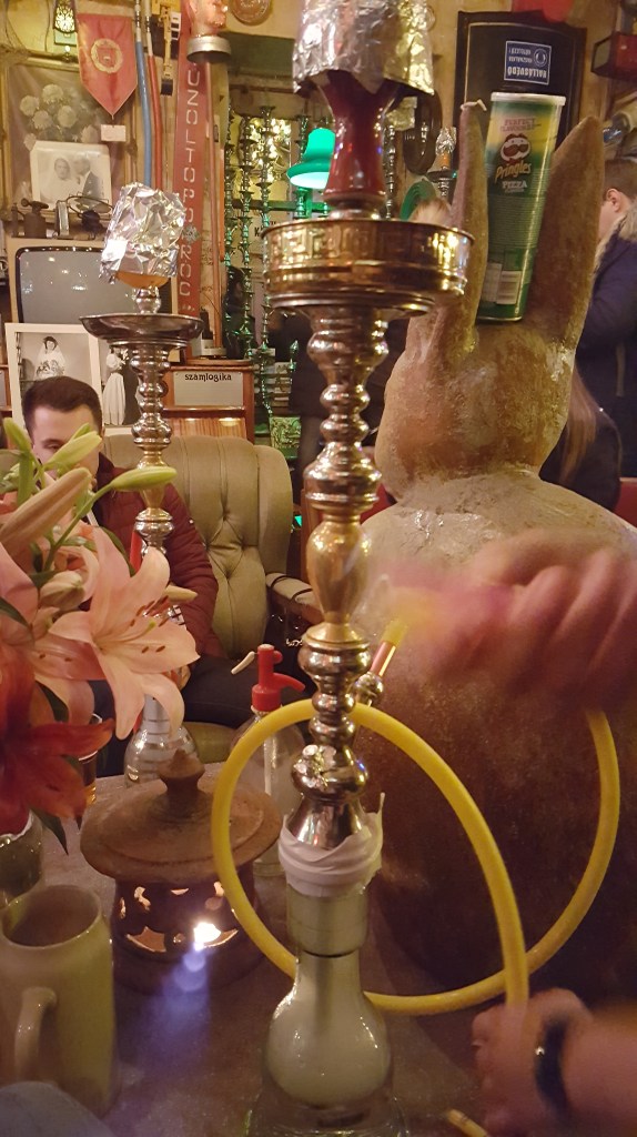 Para acabarmos a noite, depois deste falhado jantar, fomos outra vez para o Szimpla Kert. Aquilo já estava cheio apesar serem apenas 8 e meia, mas depois de andarmos às voltas, conseguimos uma mesinha no sítio das shishas. Experimentámos uma com sabor a pina colada. Ainda bebemos uma cervejita e deixámo-nos ficar até às 11 e meia. Apesar de ter sido um dia muito comprido, aquele final deu para relaxar e ainda nos rirmos das nossas figuras a fumar a shisha.